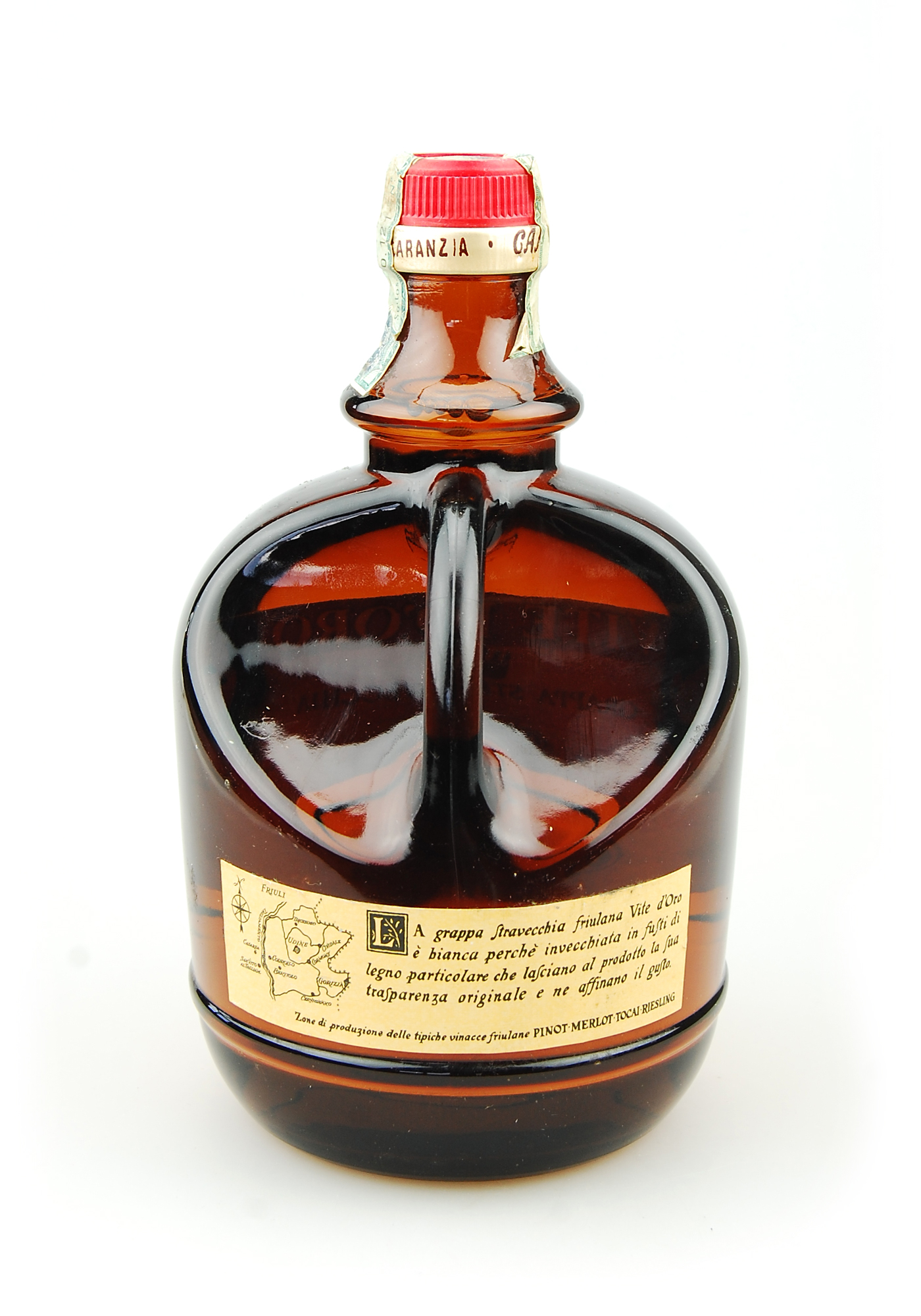 Ein Jahrgangsgrappa Vite d´Oro Stravecchia 1970 aus dem traditionsreichen und renommierten Erzeugerhaus von Camel, einem Friauler Erzeugerhaus, welches mitunter zu den renommiertesten Häusern Italiens zählt. Die Distillierie liegt direkt am Fuße der Osthügel im Friaul, in Marsure di Povoletto, nicht weit von der langobardischen Stadt Cividale entfernt, einem Weinbaugebiet, das bekannt für erstklassigen Trauben und Trester ist.