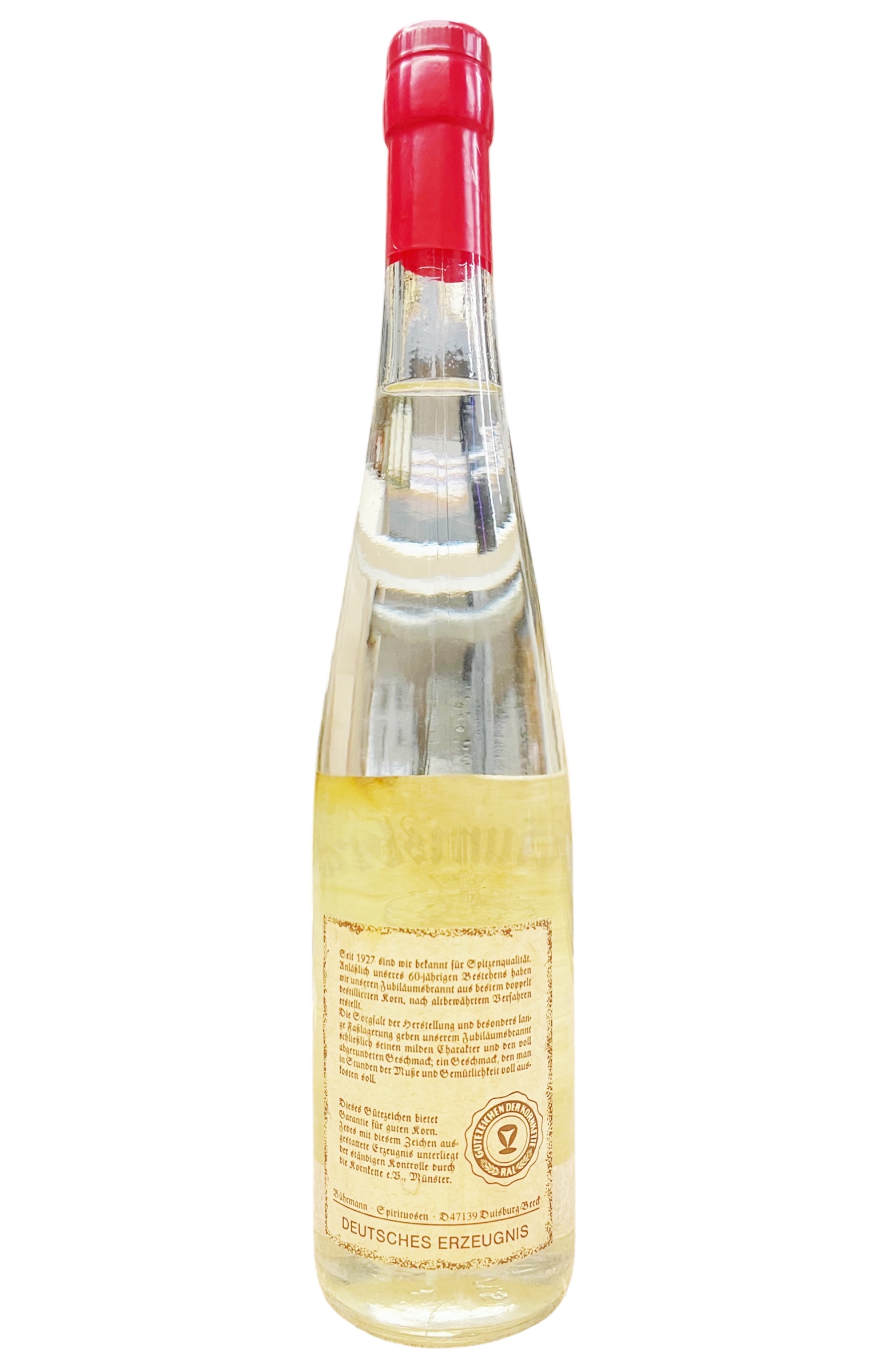 Grandiose und exklusiver, milder Jahrgangs-Korn aus dem alten und traditionsreichen Unternehmen der Familie Bührmann in Duisburg, Deutschland. Korn ist ein alkoholisches Getränk, welches aus Getreide produziert wird. Hierzu dürfen die Sorten Gerte, Hafer, Weizen und Buchweizen verwendet werden, hauptsächlich kommen aber Hafer und Weizen zur Verwendung. Der Korn oder der ab 37,5% Alkohol haltige Kornbrand gehört zu den sogenannten klaren Bränden.