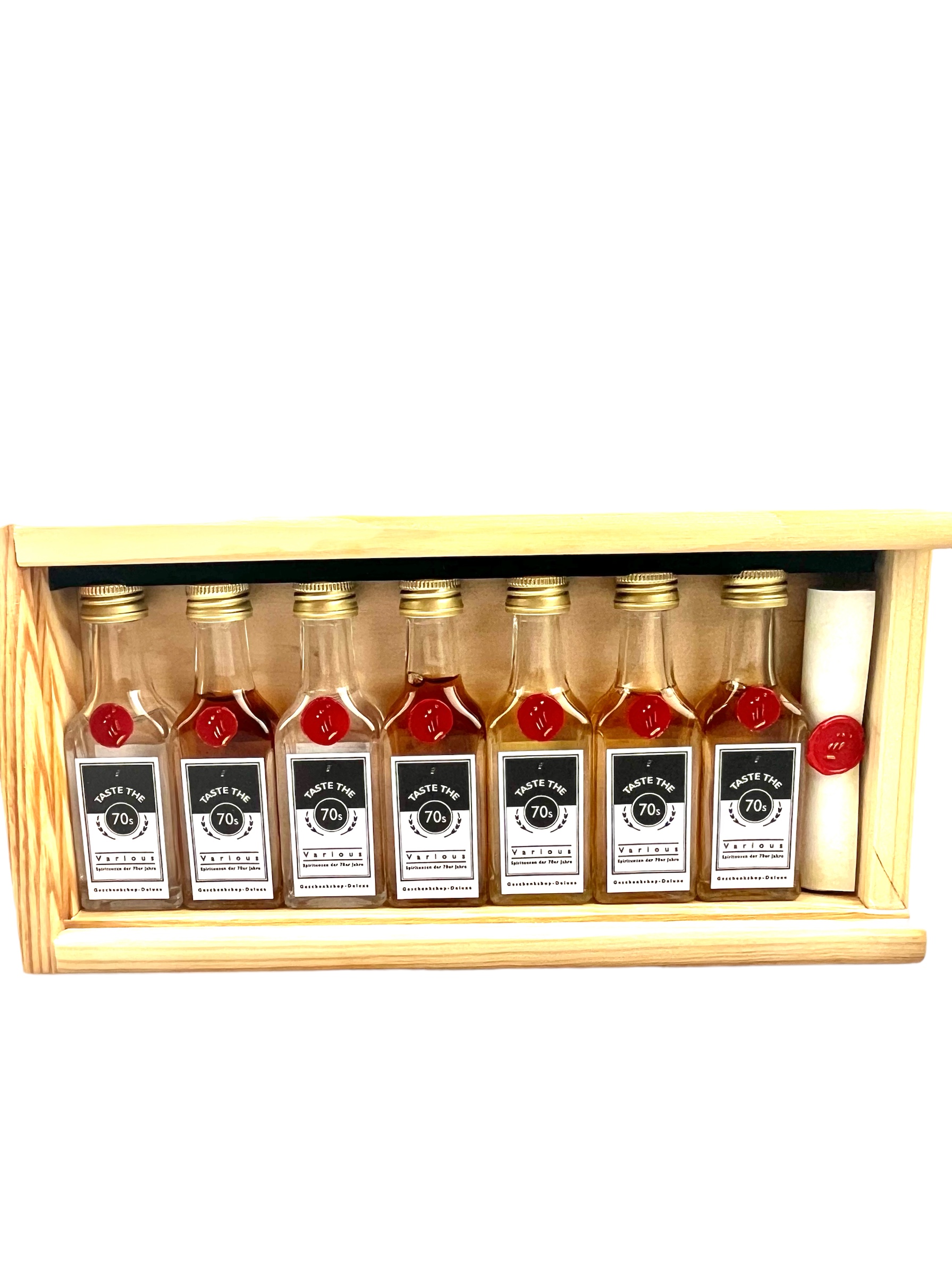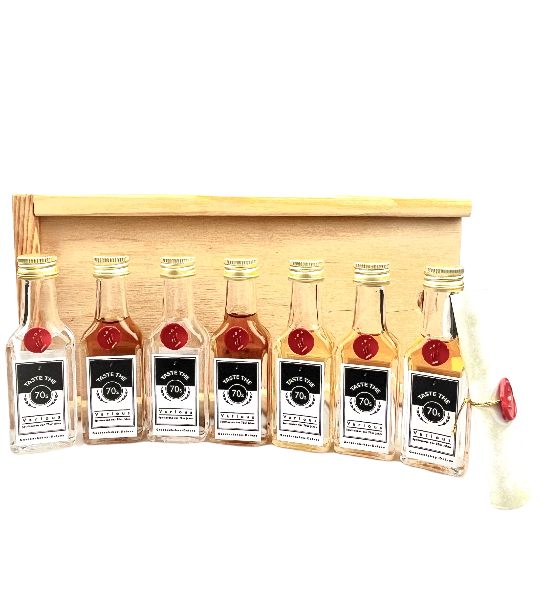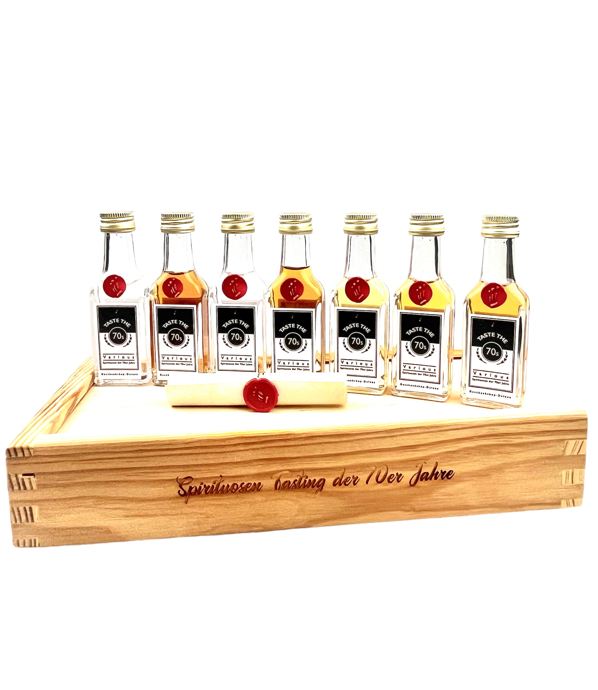 Dieses spannende Probier-Set bietet ihnen die perfekte Möglichkeit 7 verschiedene Spirituosen der 70er Jahre zu testen. Dieses Tasting-Set verführt sie in eine geheimnisvolle Zeitreise und bietet den Beschenkten, die in den Jahren zwischen 1970 und 1979 geboren wurden, großartige Genussmomente mit verschiedensten Spirituosen-Arten für jede Geschmacksrichtung. Lassen sie sich überraschen von den beindruckenden Raritäten-Probierfläschchen der 70er Jahre inklusive Kurzbeschreibung der jeweiligen Abfüllungen in einzigartiger Echtholzkiste, auf Wunsch auch mit ganz persönlicher Personalisierung.